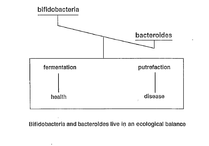 Simplified, you could separate the bifidobacteria as the good ones and the bacteroides as the evil ones. Bifidobacteria split the food by fermentation. Lactic acid, acetic acid and butyric acid are produced. These will create a more acidic environment in the intestine.