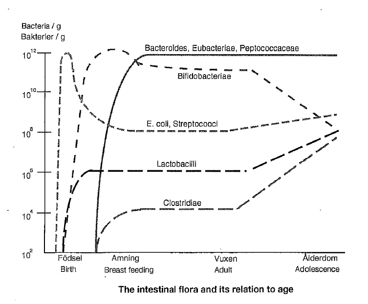 Streptococci, enterococci, and enterobacteria (i.e., colibacteria) are found in minor quantities. In adolescents, the quantity of bifidobacteria is lower.